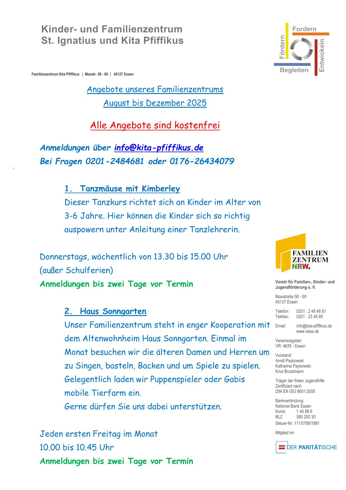 - Anmeldungen für die Angebote unseres Familienzentrums nehmen wir bis zum 22. August 2025 entgegen
