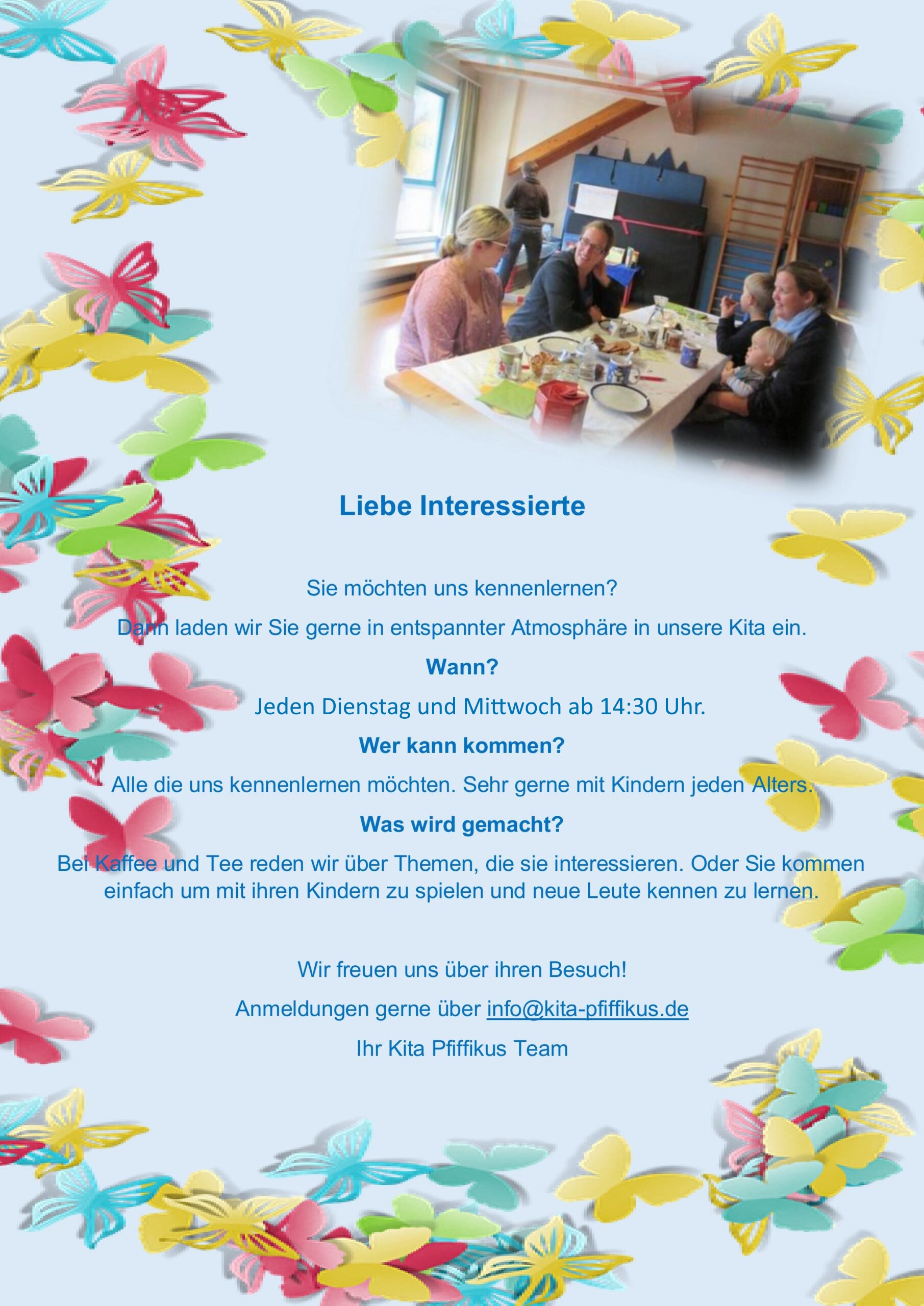 - Wir heißen Sie auch herzlich Willkommen in unserem Elterncafé mit Kind. Jeden Dienstag in der Zeit von 14.30 bis 16.00 Uhr. Anmeldungen hierfür bitte unter info@kita-pfiffikus.de